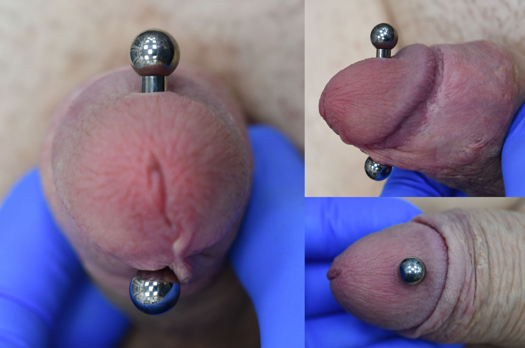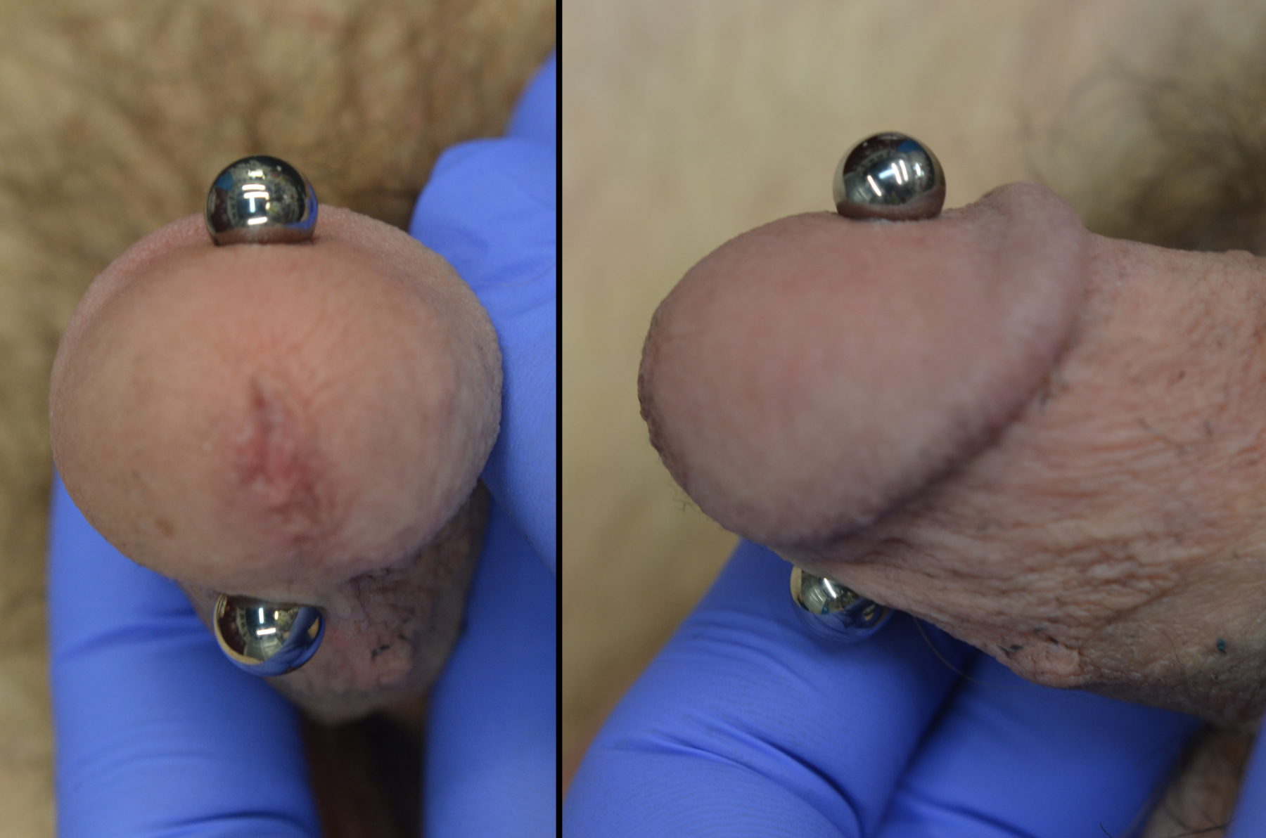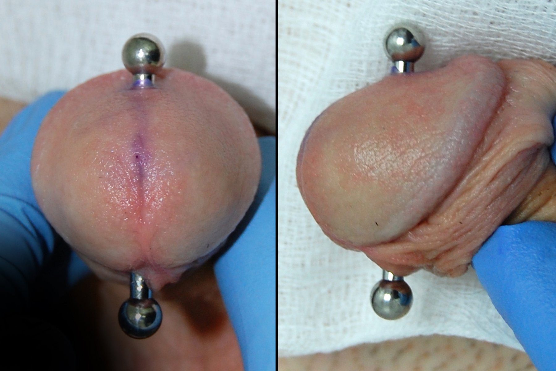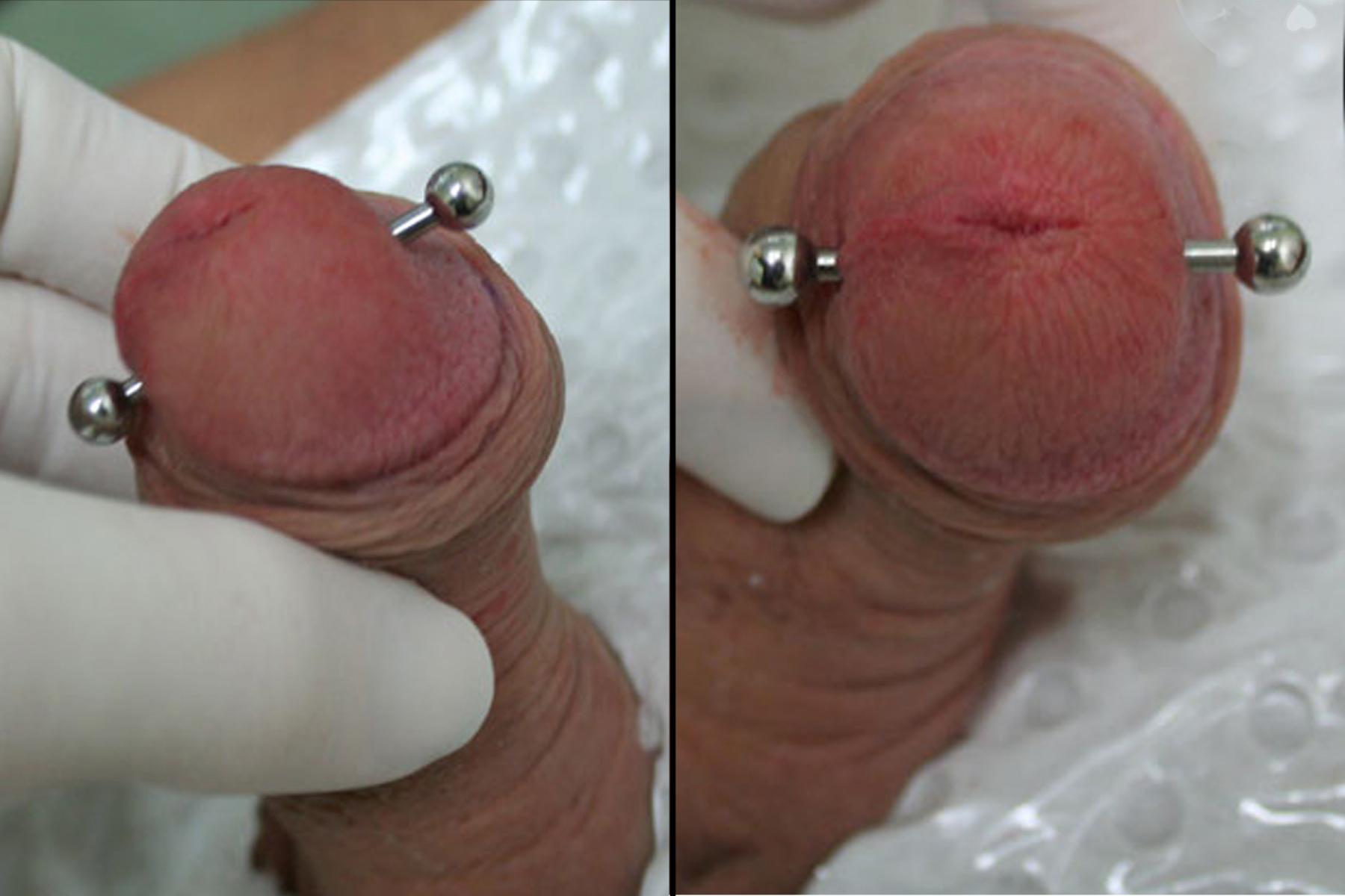 Ampallang’s (side to side), and Apadravya’s (top to bottom) piercings both go directly through the head of the penis, passing through the urethra.