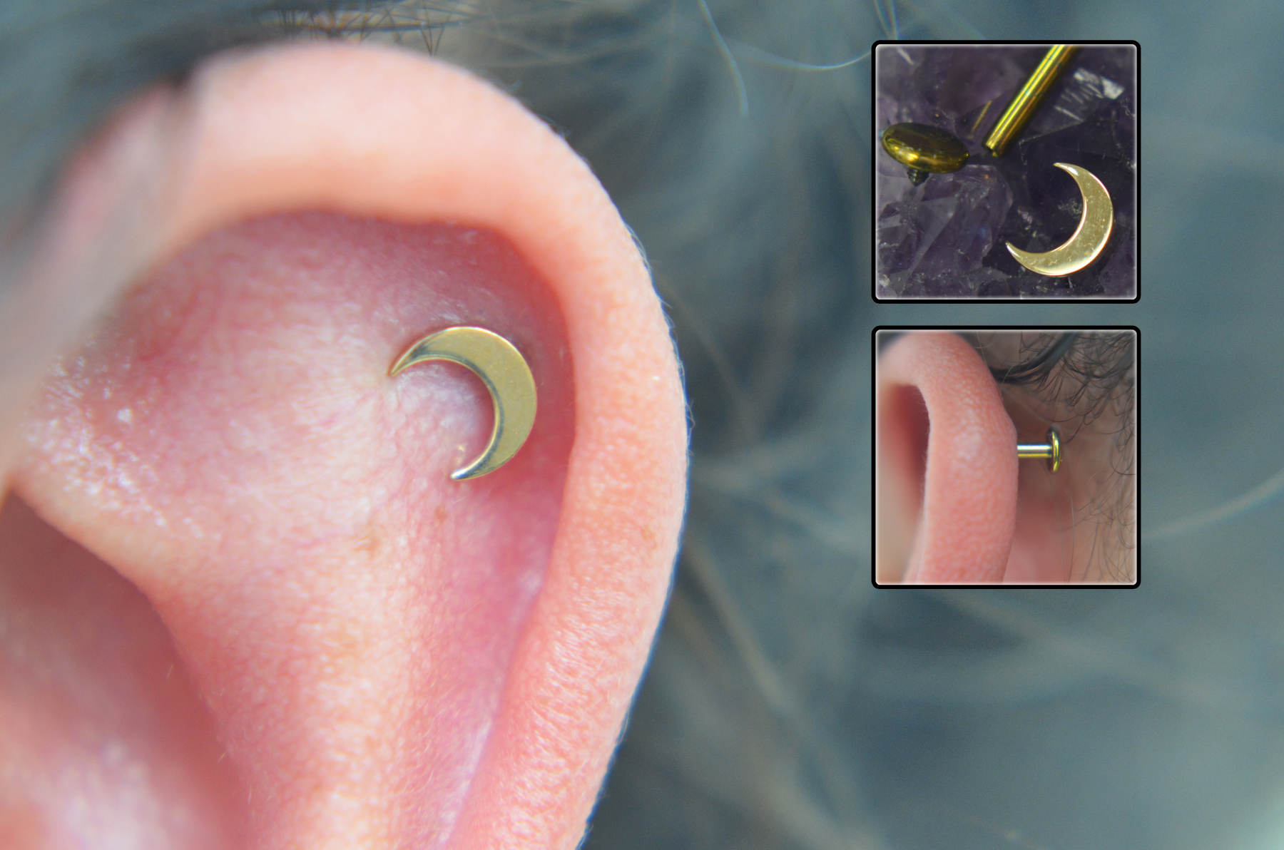 The outer conch lacks protection from surrounding skin and therefore should be initially pierced with low profile jewellery that will sit flat to your anatomy. They require regular check-ups with your practitioner, to ensure appropriate healing.