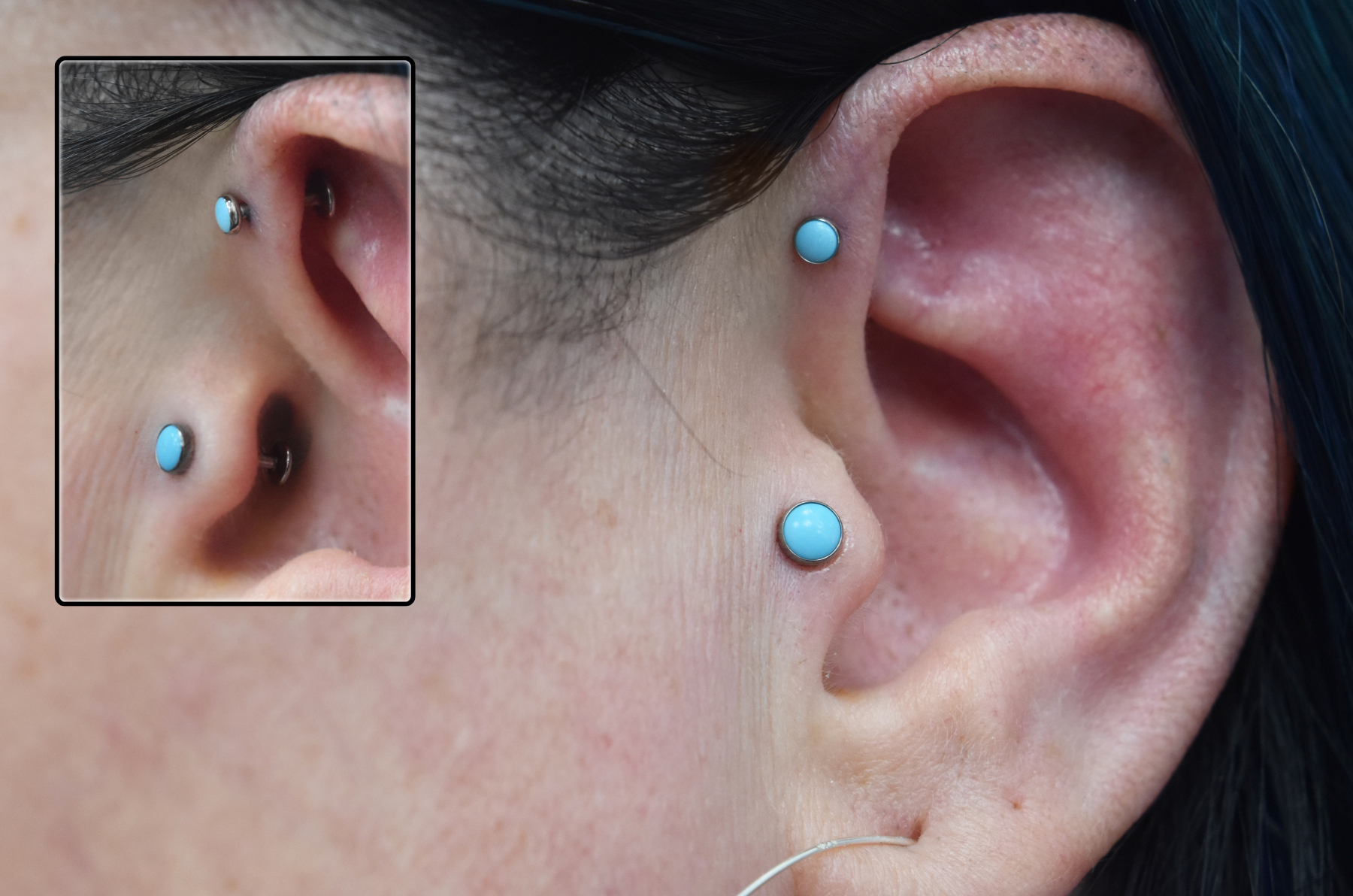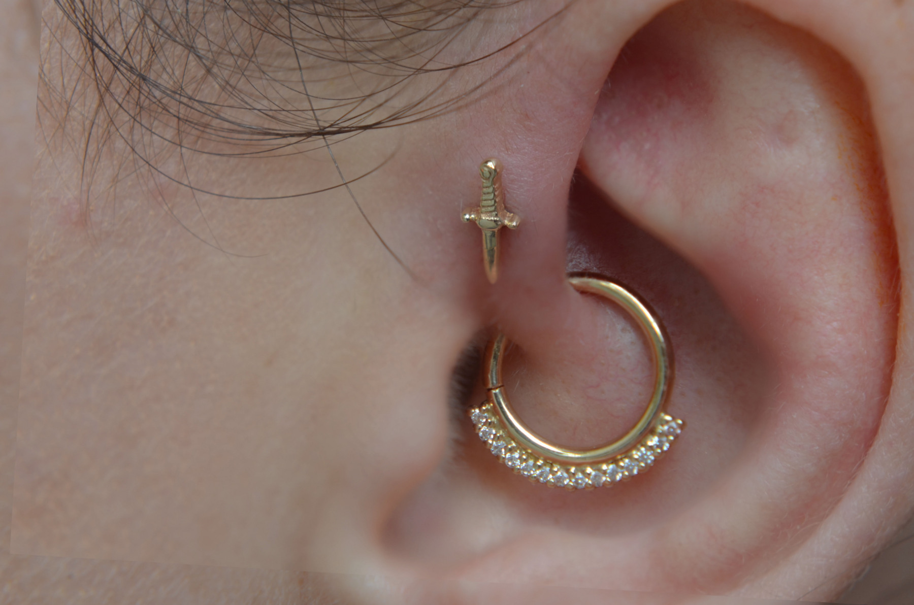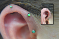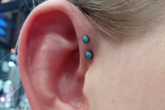 The Forward Helix (affectionately called ‘Felix’) piercings are a fun little decoration for your ear and can be done in singles, pairs or sometimes even multiples! Remember that not everybody is anatomically structured for these, so a consultation is required before getting your heart set on a look.
