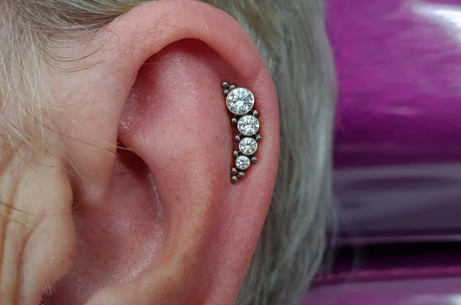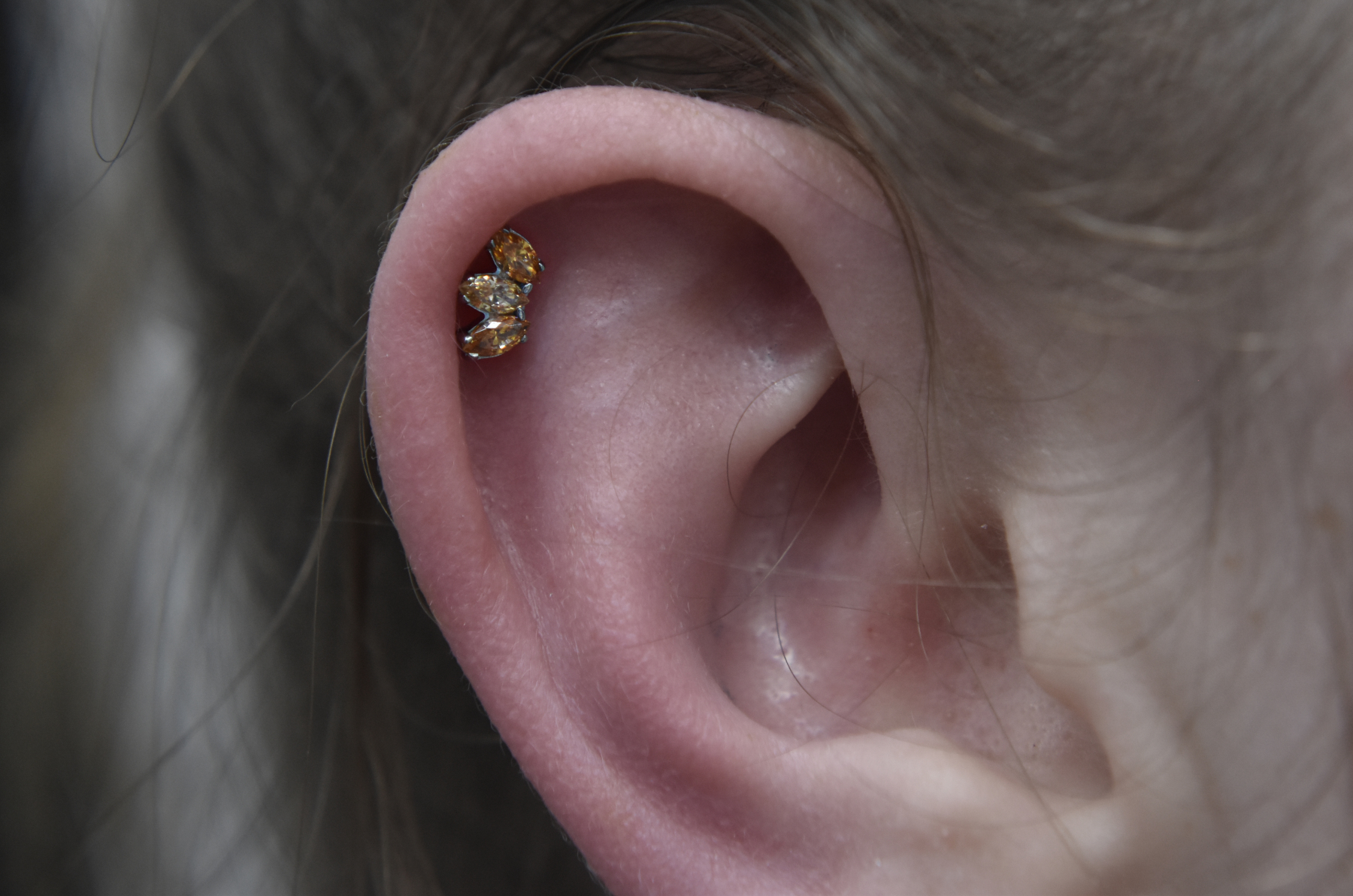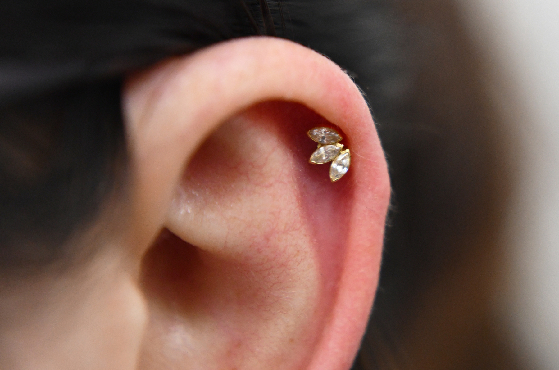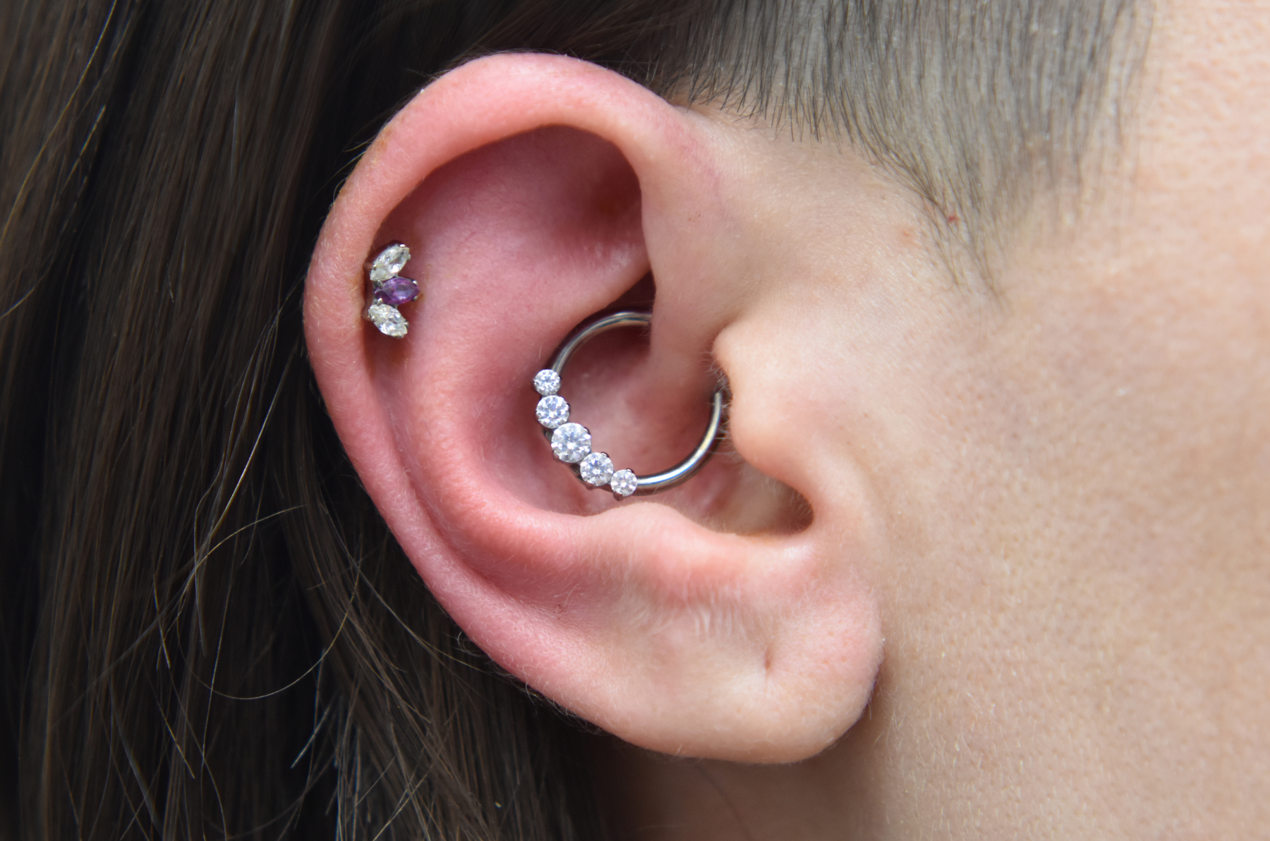 Helix piercings are one of the most popular piercings and can be done singularly or in multiples. Rings can be comfortably worn once healed and can accommodate different types of jewellery – including clusters, chains, and rings!