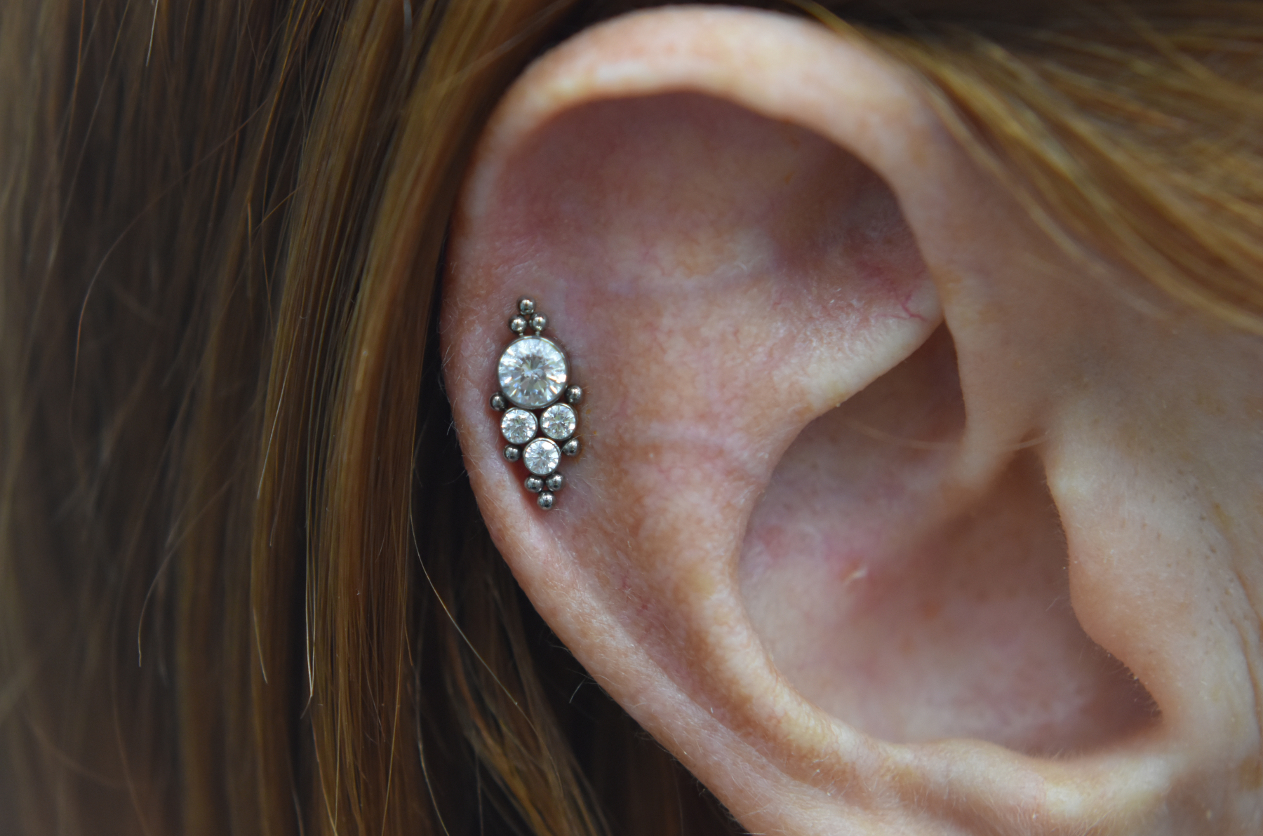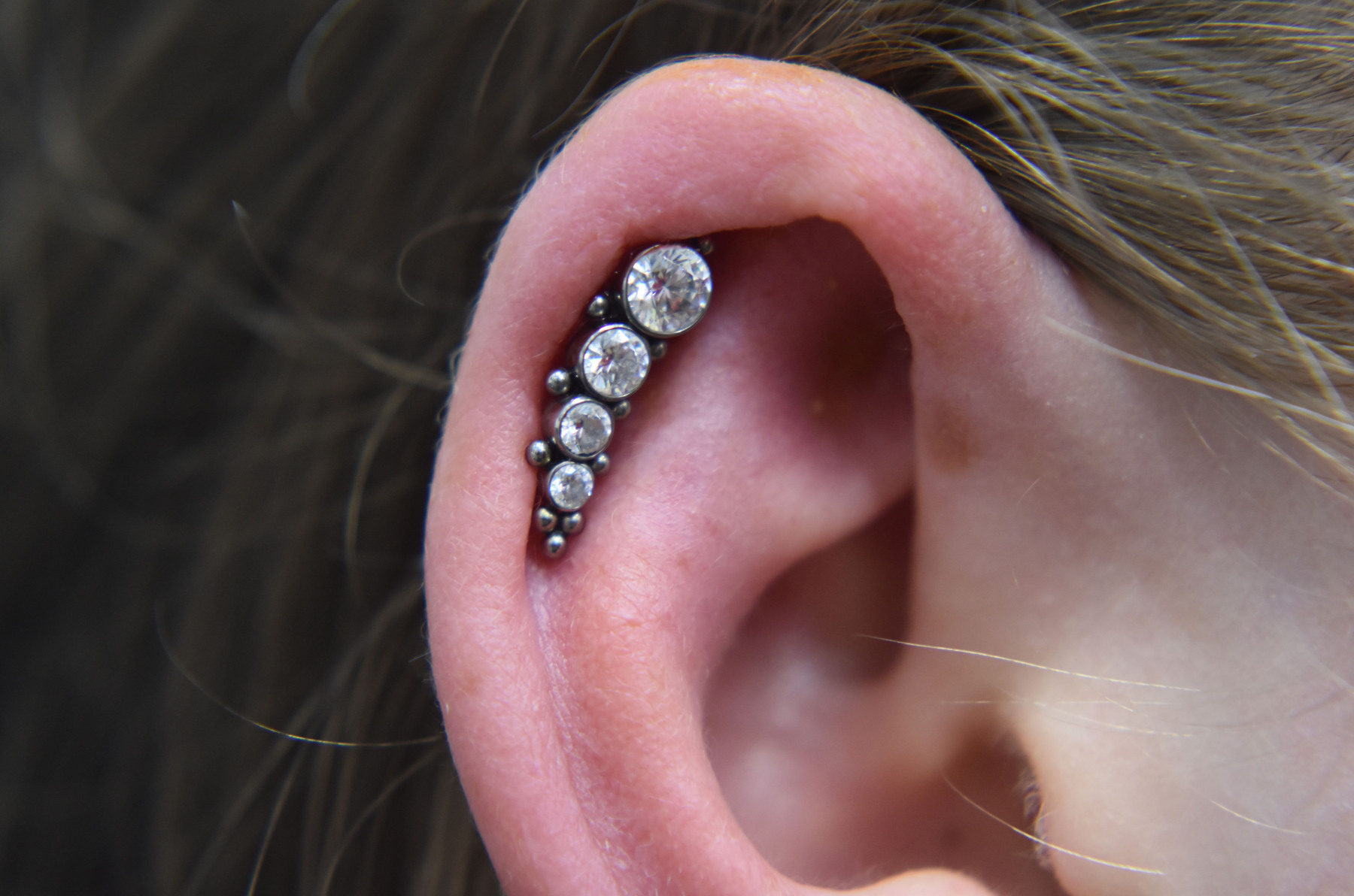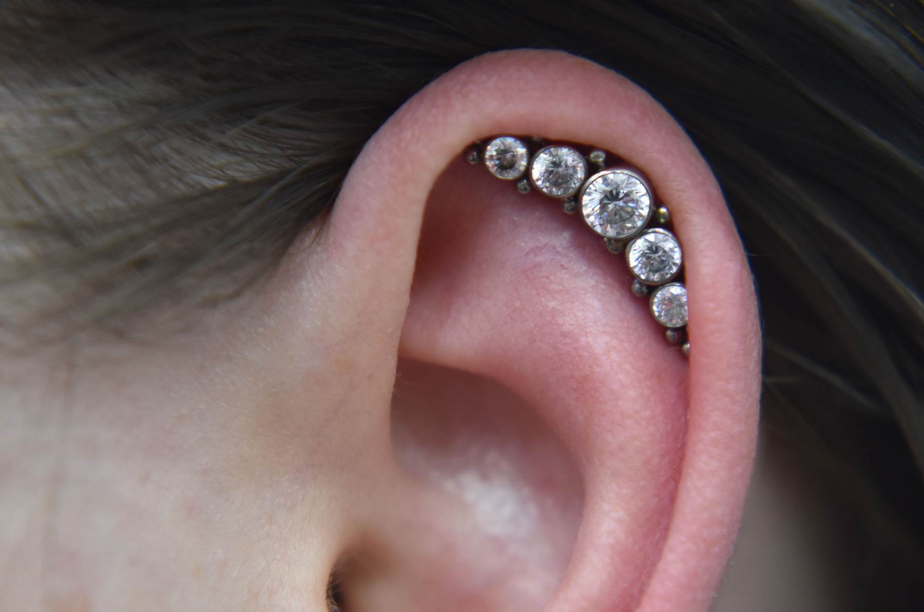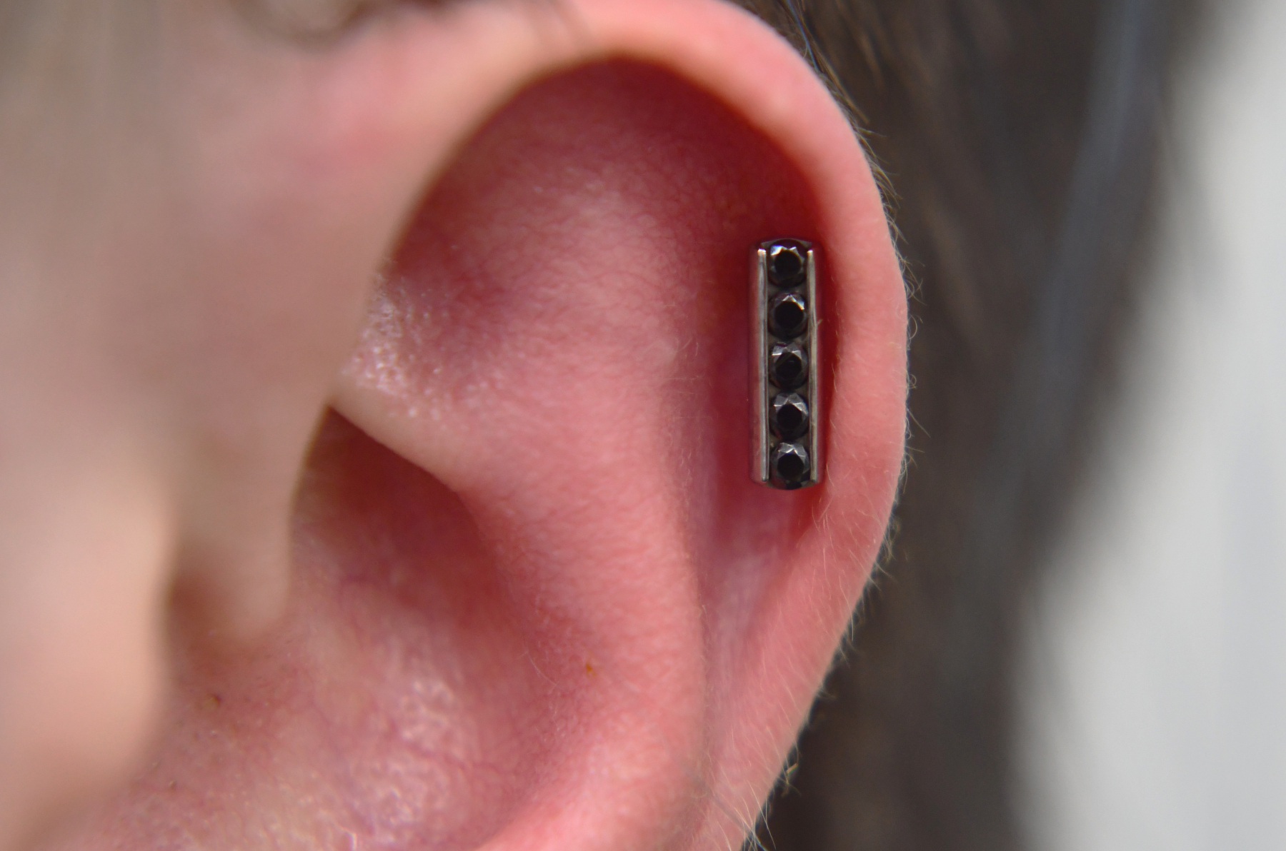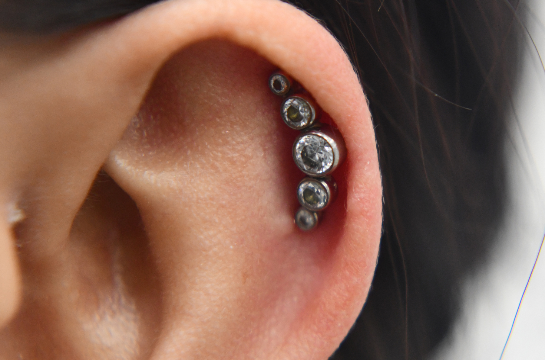 Helix piercings are one of the most popular piercings and can be done singularly or in multiples. Rings can be comfortably worn once healed and can accommodate different types of jewellery – including clusters, chains, and rings!