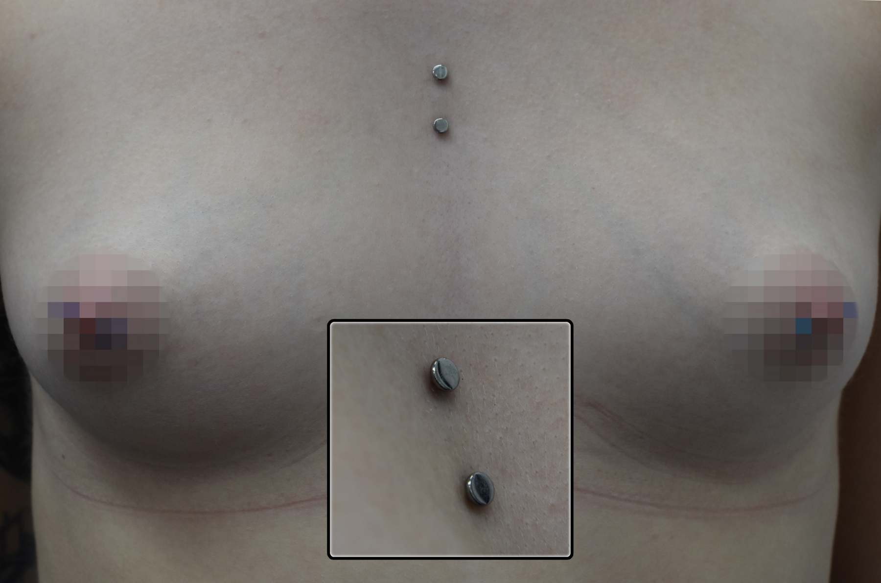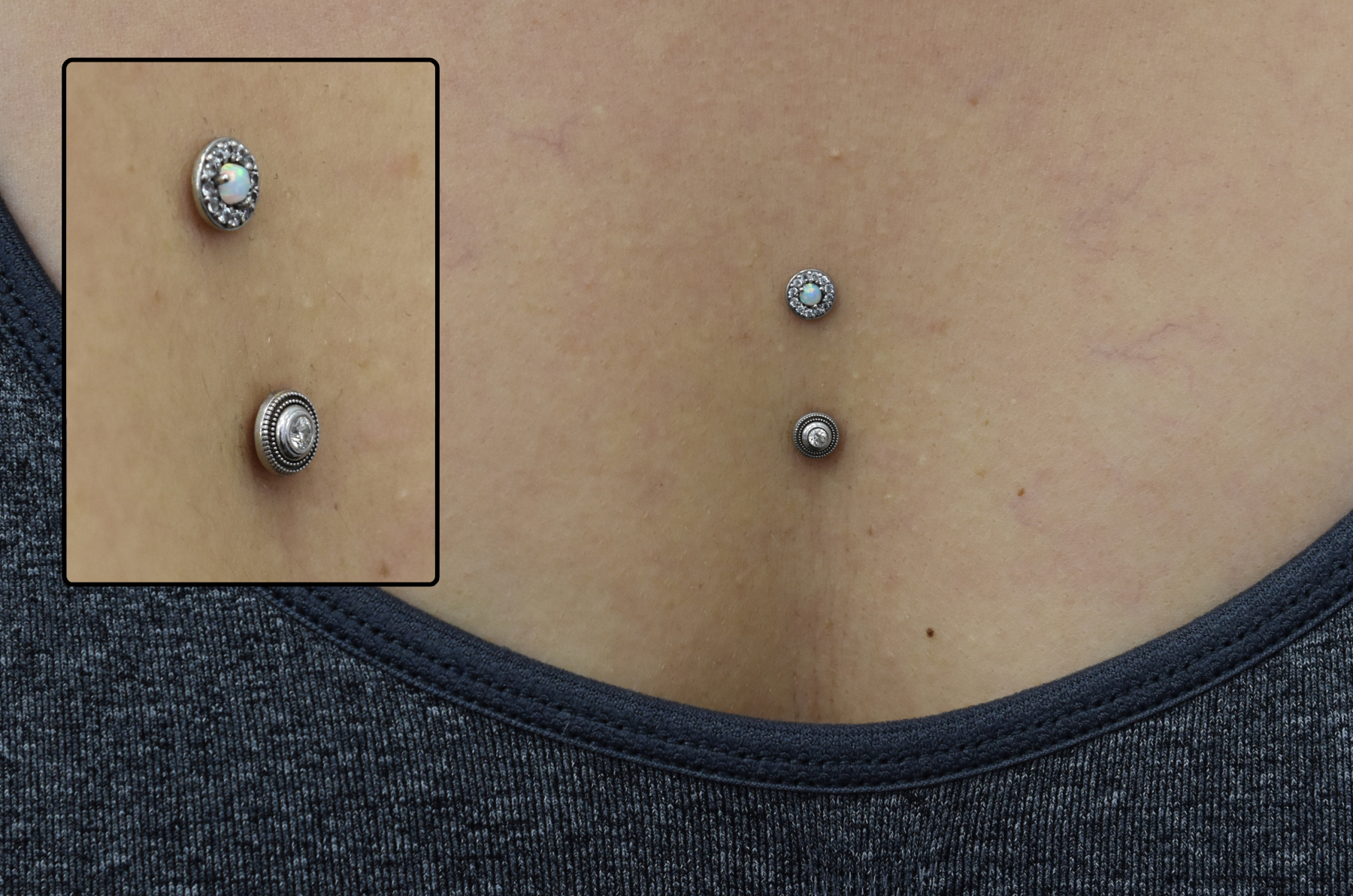 Surface piercings (imagine an upside-down staple with threaded ends) can be placed nearly anywhere; however, low mobility areas (such as the back of the neck or the centre sternum) have the highest success rate.