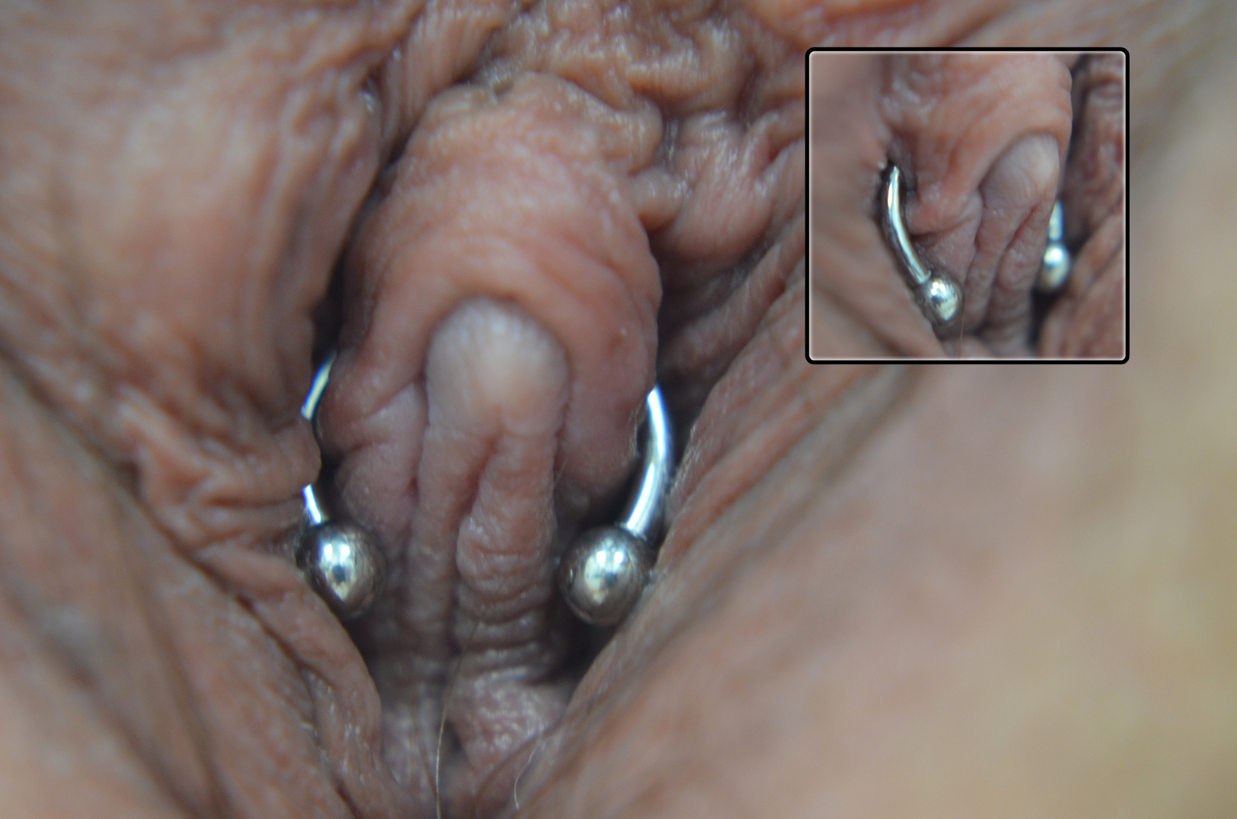 Bleeding can occur for the first week due to the vascular nature of the tissue it passes through, and often a spread-outwards circular barbell (horseshoe) is worn for the healing, allowing the jewellery to rest between the labia majora and minora.